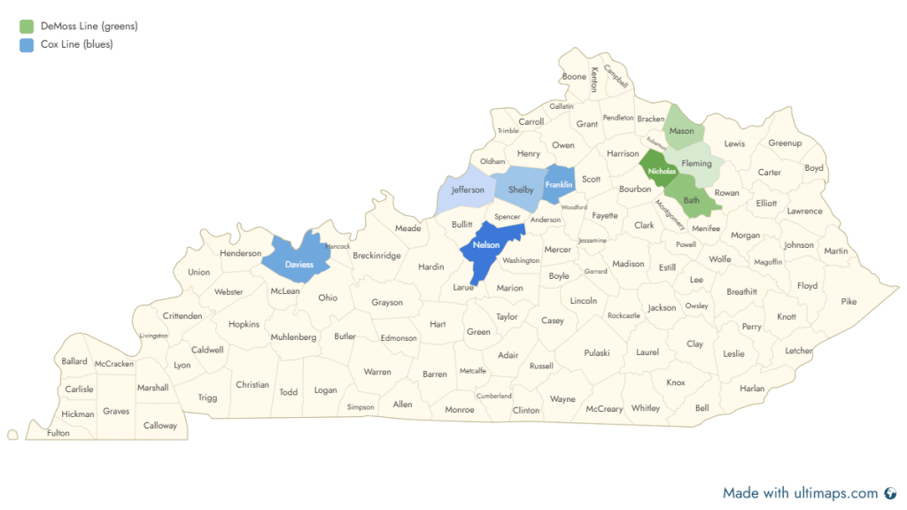 I love maps! They help to tell the story, especially with migration. I found a new (to me) site that has me all giddy about creating maps. It’s called Ultimaps. I am forever wanting to illustrate where certain counties are in relation to others. This site has a blank county map of Kentucky and I can colorize it however I want! I’ve started by shading in the counties where my DeMosses are and where my Cox families are. I do have other lines that came thru Kentucky which I will add later.