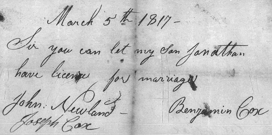 I should be able to finish up Jonathan Piety Cox’s bio before the day is over. He was my focus during Week 33. Since he had not yet reached his majority when he married in 1817, he needed his father’s permission to obtain the marriage license. I think it is so cool that an image of the permission note is available and carries the handwriting and signature of my 5th great-grandfather.