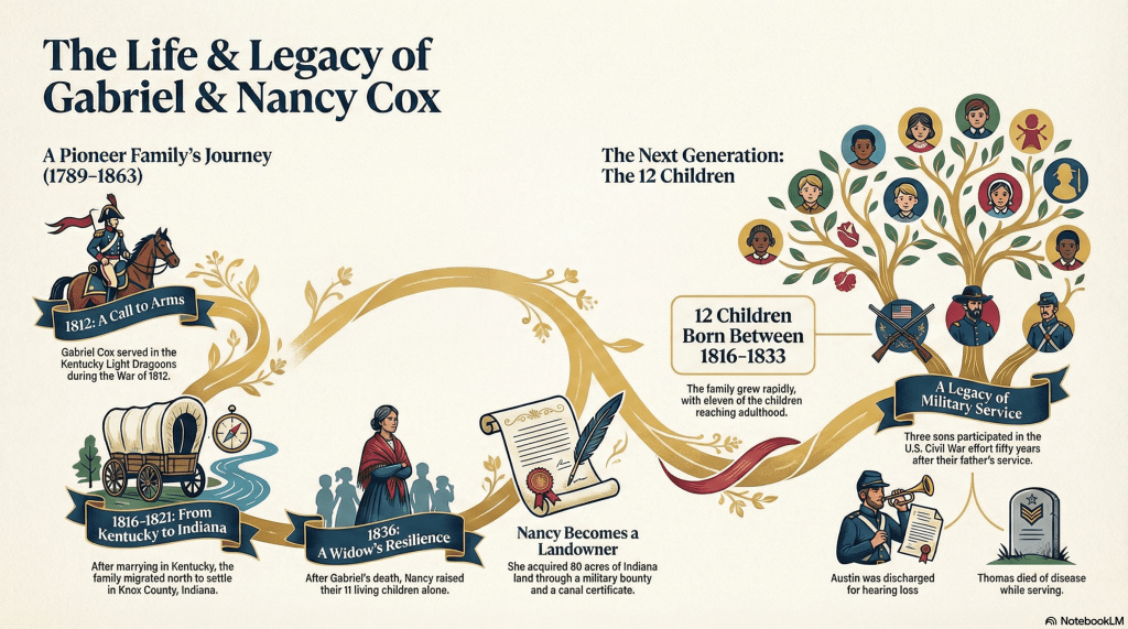 I’ve been playing around with Google’s NotebookLM. I really like the concept of the Infographic. Too bad the free version only gives you three per day. Need to be selective in what you create! I have noticed that when I do a document dump, it tends to make up names and dates, making the graphic worthless. I decided to upload the narrative I wrote for a single family unit–in this case, Gabriel and Nancy (Squires) Cox–to see what it might do. So. Much. Better! It didn’t mention John S Cox having served and died in the Civil War, but that was because his story was told in a previous chapter, focusing on him. I’ll have to decide what to include about the linking child on future runs. At any rate, I thought I’d share the output of my experiment on Gabriel and Nancy. Once I get the process perfected, I think including these in my manuscript will break up the monotony of lots of text.