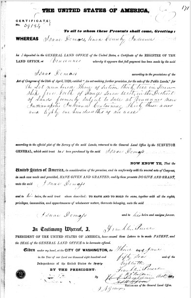 Isaac remained on the family farm until the early to mid-1850s. He set out to make his own way, heading further westward, settling along the White River which separated Daviess County from Knox County to the west. On December 8, 1855, at the age of twenty-two, he married sixteen year old Louisa Reeve, daughter of Joseph Reeve and Sarah Ireland Reeve. The following June, Isaac acquired a land patent (certificate 39184) for thirty-three acres of land along the White River bottoms.