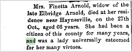 I am finishing up the bio writing for Benjamin and Sarah Piety Cox’s children this week. Having this blog has helped me with organizing facts and sources. While I didn’t do the greatest job of documenting everything on the blog, I left myself enough breadcrumbs to make it worthwhile. For instance, the Find A Grave memorial for Finetta Cox Arnold stated her death was announced in the Liberty (MO) Tribune. Thing is, I don’t ever recall finding it. I had a death notice for one of her daughters in 1882, but not Finetta. So, back to the newspaper archive. After a little searching I found what I was looking for. YAY!