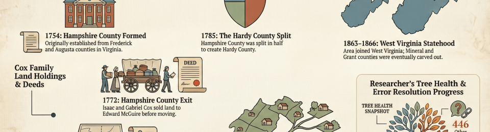 As I transition between Yohogania County and Washington County to Hampshire County, a little boundary history is necessary to optimize my search for information on Isaac Cox Sr. Hampshire County was originally formed on paper in 1754 from Frederick County and Augusta County in Virginia. Due to hostilities in the area, organized settlement of the area was delayed a few years. In 1785, Hampshire County was split in two, forming Hardy County from the southern half. No further changes in county lines were noted after 1785. In 1863 Hampshire County, along with 49 other counties to form West Virginia. Mineral County was carved out in 1866 and Grant County was formed from Hardy County. Previous publications on this Cox family have mentioned the Cacapon River which runs north-south in the eastern part of Hampshire County. Records search will focus mainly on that area.