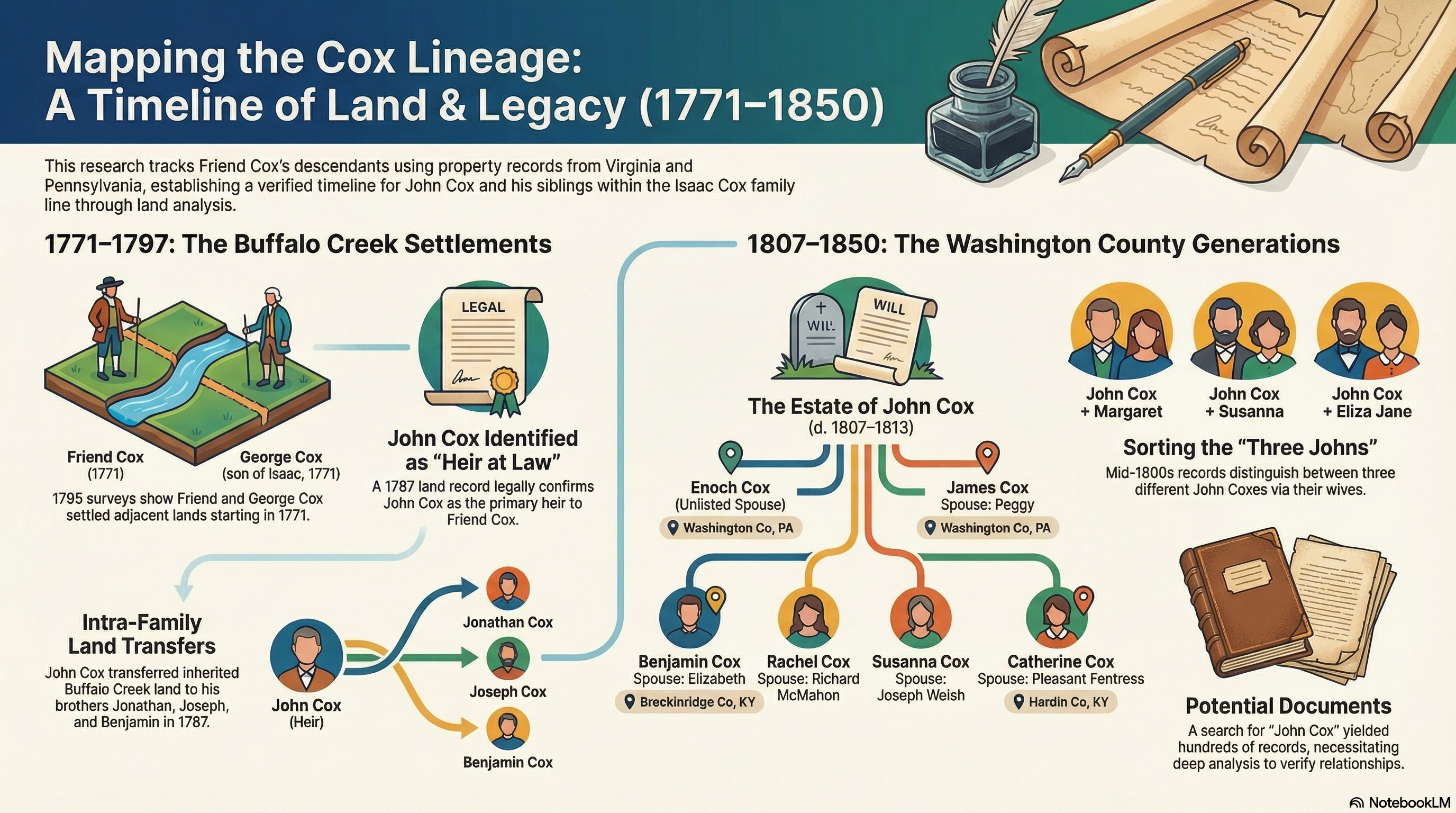 - 1813 & 1817, Washington County, PA – A pair of property transfers to Enoch Cox, son of John Cox, from his siblings James Cox (wife Peggy) of Washington Co, PA; Benjamin Cox (wife Elizabeth) of Breckinridge Co, KY; Rachel Cox McMahon (husband Richard); Susanna Welsh (husband Joseph); Catherine Fentress (husband Pleasant) of Hardin Co, KY. James died between the execution of the two transfers.5