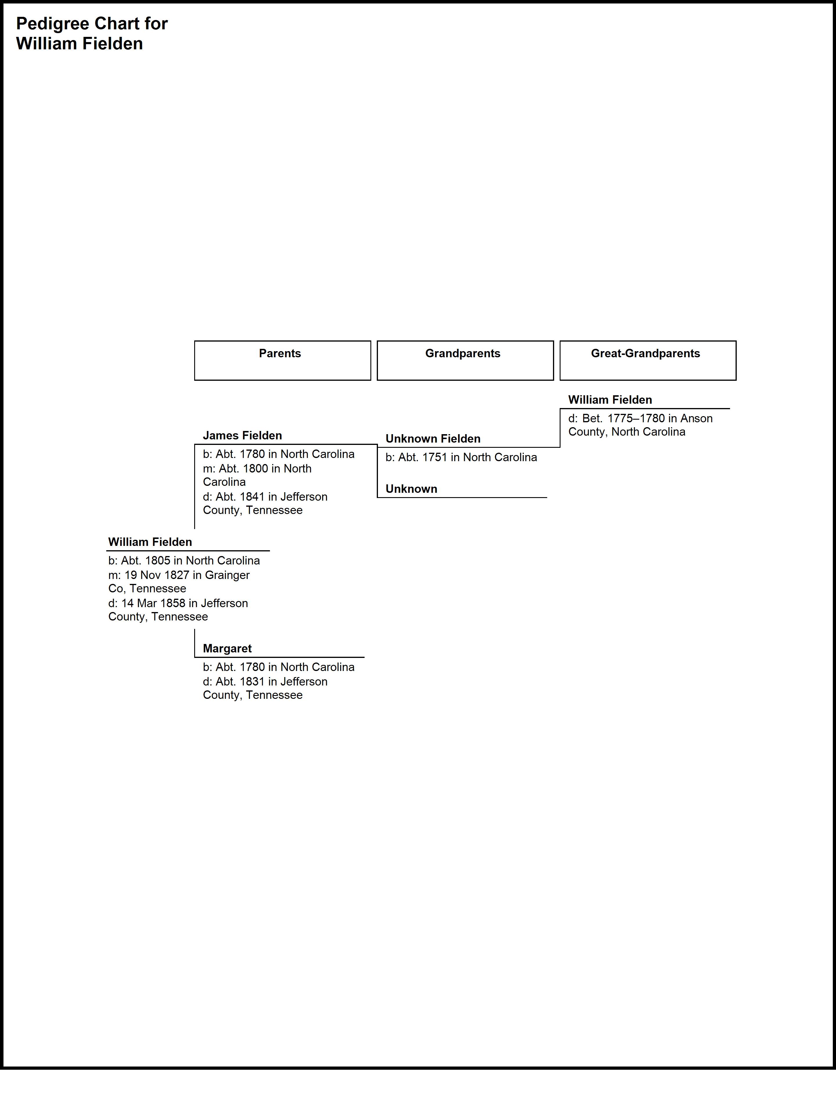 Pedigree Chart for William Fielden (b. ca. 1805), a continuation of Lillian Edeine Fielden.